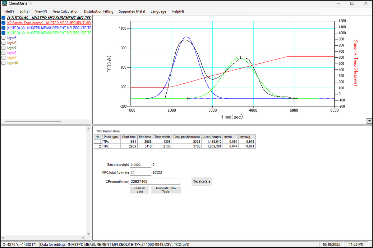 This method is known for examining the chemical adsorption characteristics on solid surfaces and is generally represented by a spectrum with desorbed gas concentration as the y-coordinate and temperature as the x-coordinate. By continuously increasing the sample temperature and detecting the desorbed gas, it is possible to determine the amount and strength of energetically distinct adsorption sites. Typically, NH3-TPD is used to evaluate the acidic sites of solid acid catalysts, whereas CO2-TPD is commonly employed to assess the basic sites of solid base catalysts; in addition, CO-TPD and often H2-TPD are applied to characterize active metal centers.