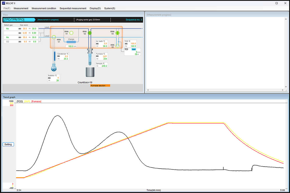 | Simple operation measurement function | Dedicated tabs for standard analyses (TPR, TPD, TPO, and BET) enable easy programming and real-time monitoring of operational status, TCD charts, temperature, and flow rates. |