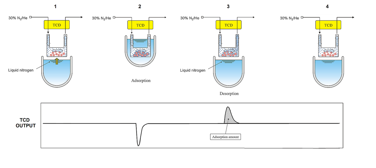 吸附质将被吸附在试样上并且混合气体中吸附质气体的浓度会降低,此时,可以确定探测器信号(TCD)中的波动(峰值)。当吸附达到平衡时,混合气体中被吸附气体的浓度将恢复到其原始数值,进而导致 TCD 信号恢复到其基线。如果此时停止冷却(杜瓦瓶下移),吸附质将从试样中脱附。